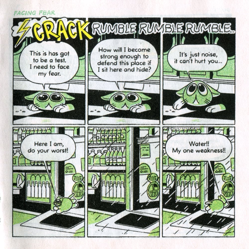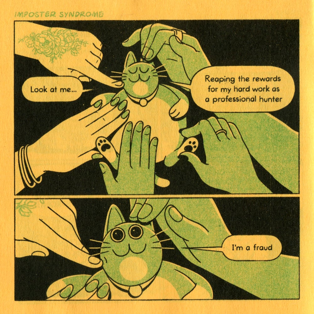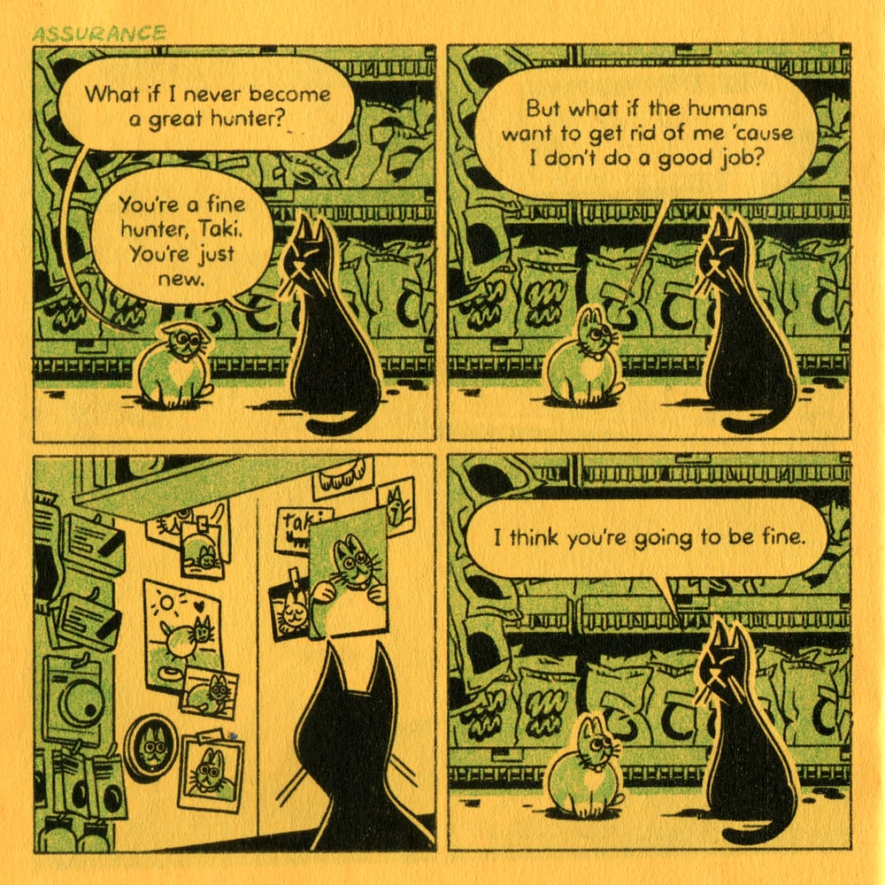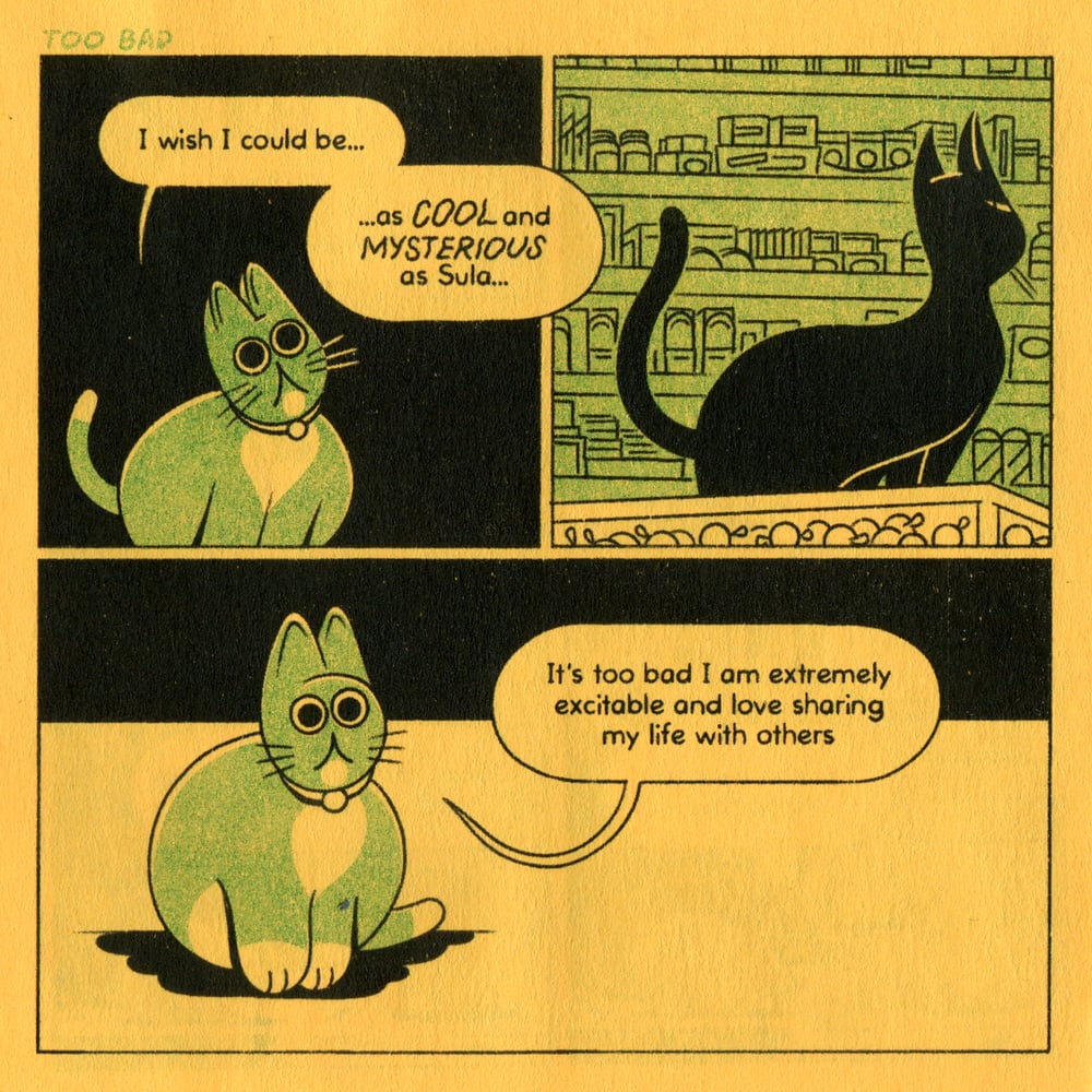The fourth installment of the comic series about the new kitten on the block. Two (sometimes three)-color, 4" x 4" zine, printed on yellow interior pages.